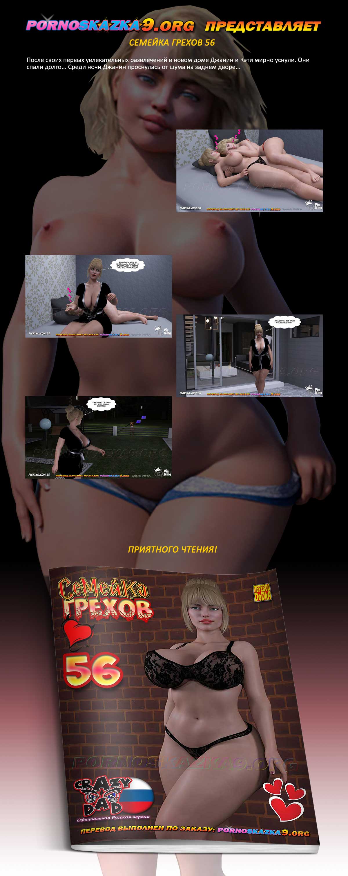 Порно комикс «Семейка грехов. Часть 56». После своих первых увлекательных развлечений в новом доме Джанин и Кэти мирно уснули. Они спали долго… Среди ночи Джанин проснулась от шума на заднем дворе…